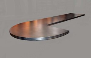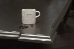 To get the sophisticated cafe-style edge profiles, we use the same edge profiles typically used on wood countertops, which blends the modern look of metal with the classic style of a wood island countertop.